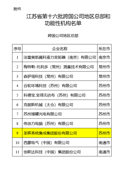 On December 25, 2025, the Jiangsu Provincial Department of Commerce issued the 'Notice Regarding the Designation of the 16th Batch of Multinational Corporations' Regional Headquarters and Functional Institutions in Jiangsu Province' (Su Shang Zi Han [2025] No. 738). Pursuant to the provisions outlined in the 'Notice of the Jiangsu Provincial Department of Commerce and Jiangsu Provincial Department of Finance on Encouraging Multinational Corporations to Establish Regional Headquarters and Functional Institutions in Jiangsu (2024 Edition)' (Su Shang Gui [2024] No. 1, hereinafter referred to as Document No. 1), 11 enterprises, including the Company, have been officially designated as regional headquarters of multinational corporations in Jiangsu Province following review.